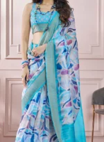 - The saree comes paired with a Aqua Blue Soft Silk Printed Zari Woven Blouse designed to complement the sarees elegance. The blouse can be customized to your preferred style whether its a classic round neck a bold Vneck or even a chic sleeveless design. This customization option allows you to tailor the outfit to suit your personality and the occasion.