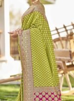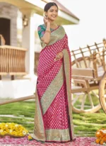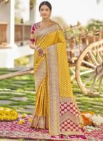 Adorn yourself in the epitome of elegance with this resplendent yellow saree exquisitely crafted to captivate hearts and turn heads. Crafted from luxurious art silk its vibrant yellow hue evokes a sense of joy and radiance perfect for any celebratory occasion. The saree is adorned with intricate Benarasi zari and jacquard work showcasing a harmonious blend of traditional craftsmanship and contemporary allure. The golden motifs delicately woven into the fabric add a touch of regal splendor elevating its allure to new heights. Contrasting the sunny yellow backdrop delicate pink accents grace the saree creating a captivating visual contrast that accentuates its beauty. The subtle yet striking floral and motif work in pink further enhances its charm adding depth and dimension to the ensemble. Completing the ensemble is a meticulously tailored blouse in matching pink customdesigned to complement the saree flawlessly. Embellished with coordinating floral and motif work the blouse adds a touch of sophistication and completes the look with finesse. Indulge in timeless elegance and exquisite craftsmanship with this breathtaking ensemble a true testament to the timeless allure of Indian traditional attire. Whether its a wedding festival or any special occasion this ensemble is sure to make you the epitome of grace and style.