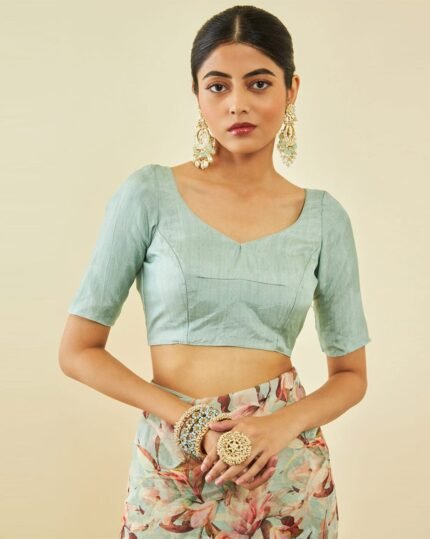 • The blouse is customizable and designed to enhance the sarees elegance. As shown in the reference image it features a V neck in the front and a U neck at the back with both necklines cut to a medium depth. It rests comfortably at the natural waist and is styled with optional half sleeves. The back is detailed with a keyhole cut and tie up dori adding a traditional touch to its classic silhouette.