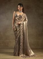 - Grey fendi satin silk saree is a contemporary statement piece designed to enhance your festive wardrobe with a unique shimmer and refined elegance. The fabric carries a textured sheen that drapes smoothly and creates a fluid silhouette. Highlighting its surface are detailed hand embroidered accents arranged across the pleats and pallu. These embellishments reflect traditional artistry in a very modern palette.