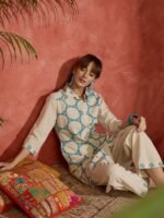 Home Kurtas & Suits Indo-Era Off White Printed A-Line Kurta Trousers Set