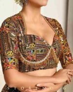 - Multicolor Thread And Sequins Embroidery Works On Black Georgette Blouse With Golden Beads And Tassel Detailing’s On front.