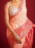 • Designed to flatter a variety of body types the blouse is cut in a classic yet contemporary style with a comfortable fit that ensures ease of movement. The combination of the peach faux georgette saree with its intricate embroidery and sequins paired with the luxurious satin silk blouse creates a timeless outfit that exudes elegance and sophistication. This ensemble is ideal for those who appreciate the finer details and desire a look that is both traditional and stylish.